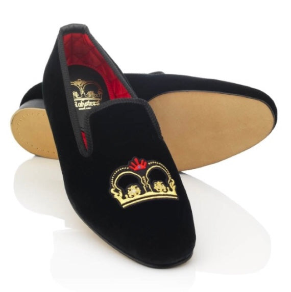 Crafted in England from plush black velvet and finished with a quilted red lining, the Black Classics embodies regal elegance. Each pair features a hand-embroidered golden crown motif, celebrating timeless heritage with a modern edge. Built on supple leather soles for comfort and durability, these slippers are as striking at a black-tie event as they are at an intimate soirée. Designed for both men and women, bringing a touch of royalty to every step.