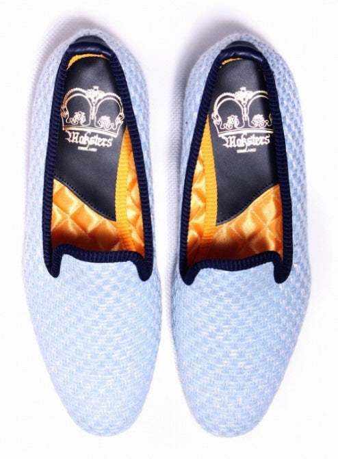 The Blu Ivy edition is crafted for both men and women, blending timeless style with modern freshness. Handwoven in soft sky-blue fabric and finished with navy trim, each pair is lined in quilted gold satin for luxurious comfort. Versatile and refined, Blu Ivy transitions effortlessly from day to evening, embodying understated sophistication with a bold edge.