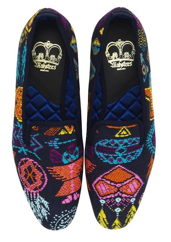 The Dreamcatchers bring artistry and symbolism together in a bold statement piece. Handcrafted in England, each pair is woven with vibrant tribal-inspired patterns reminiscent of dreamcatcher motifs, set against a deep navy base. Finished with quilted satin lining and supple soles, Dreamcatchers is a unisex design made for those who embrace culture, color, and individuality.