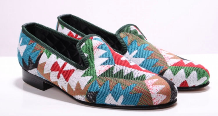 The Mykonos edition reimagines the classic slipper with a handwoven Kilim-inspired fabric, rich in geometric patterns and Mediterranean color. Designed for both men and women, each pair is handcrafted in England and finished with quilted lining for all-day comfort. A perfect fusion of heritage craft and contemporary elegance, Mykonos carries the spirit of the Aegean in every step.