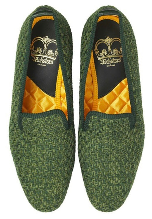 The Noels edition brings depth and texture to the Prince Albert silhouette. Handcrafted in England, these slippers feature a woven green fabric upper that contrasts elegantly with a quilted golden lining. Luxurious yet understated, Noels offers a refined touch of individuality — equally at home with evening attire or dressed-down sophistication