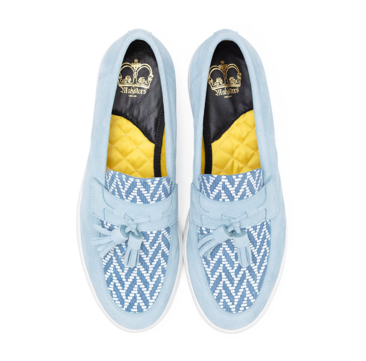 A fresh take on the Porto silhouette, the Riviera model is crafted in soft sky-blue suede with a woven patterned vamp and tasseled strap. The contrast of cool tones and crisp white sole delivers a relaxed yet refined look, while the cushioned lining ensures all-day comfort. Designed for summer by the sea, Riviera pairs effortlessly with linen trousers, chinos, or tailored shorts.