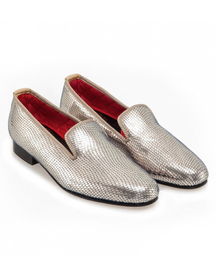 Exclusively for women, the Serpente edition brings bold elegance to the forefront. Handcrafted in England, these slippers feature a shimmering snakeskin-inspired fabric that catches the light with every step, contrasted by a quilted red lining for a touch of drama. Striking and unapologetically refined, Serpente is designed for women who command attention with effortless style.