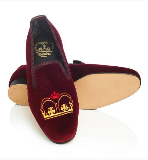 The Wine Classics edition embodies timeless refinement for both men and women. Handcrafted in England from rich burgundy velvet and embroidered with a golden crown motif, each pair is lined with quilted satin for comfort and sophistication. Elegant, versatile, and enduring — a true classic for any wardrobe.